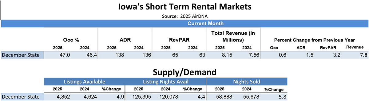 If you are interested in purchasing access to the AirDNA data dashboard, sign up here.Iowa short-term rental snapshot for December 2025: