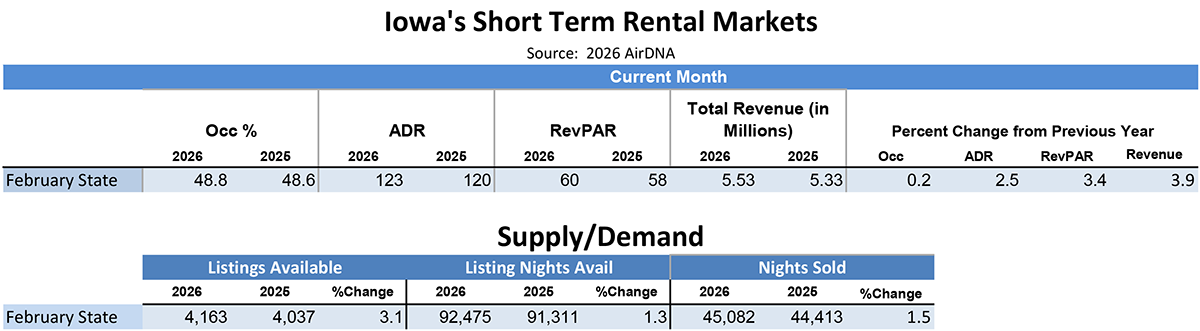 If you are interested in purchasing access to the AirDNA data dashboard, sign up here.Iowa short-term rental snapshot for February 2026:
