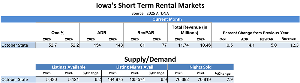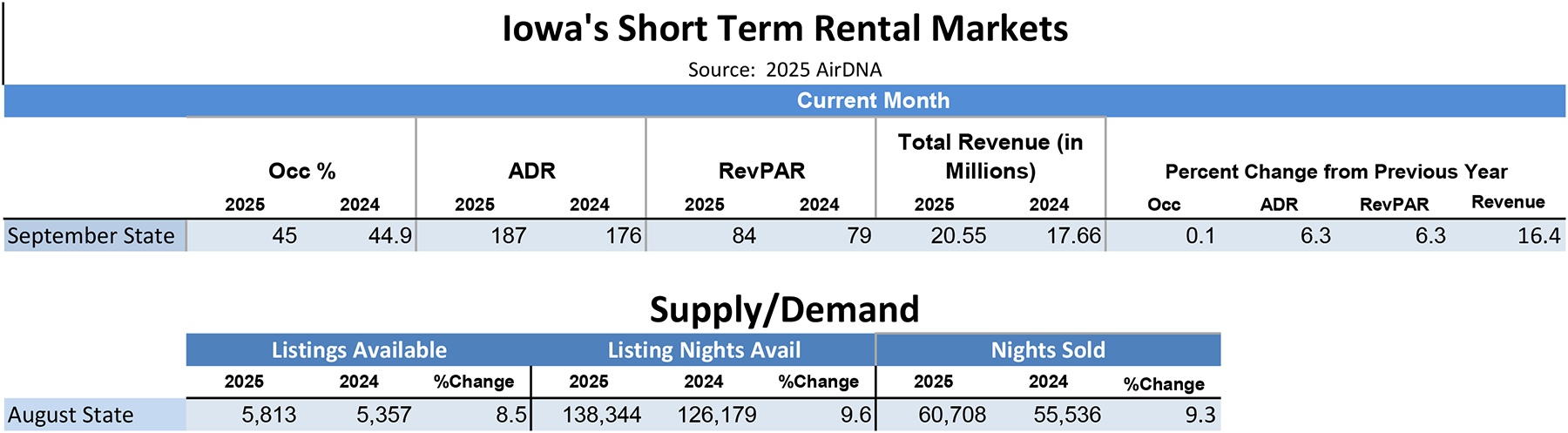 The Iowa Tourism Office is partnering with AirDNA to provide partners discounted access to short-term rental data (AirBnb, VRBO, etc.) in their jurisdiction. Data includes occupancy, supply/demand, revenue generated by short-term vacation rentals, and more. Data is updated monthly and is available for at least the previous five years. Click here to read about the new AirDNA Co-op program.